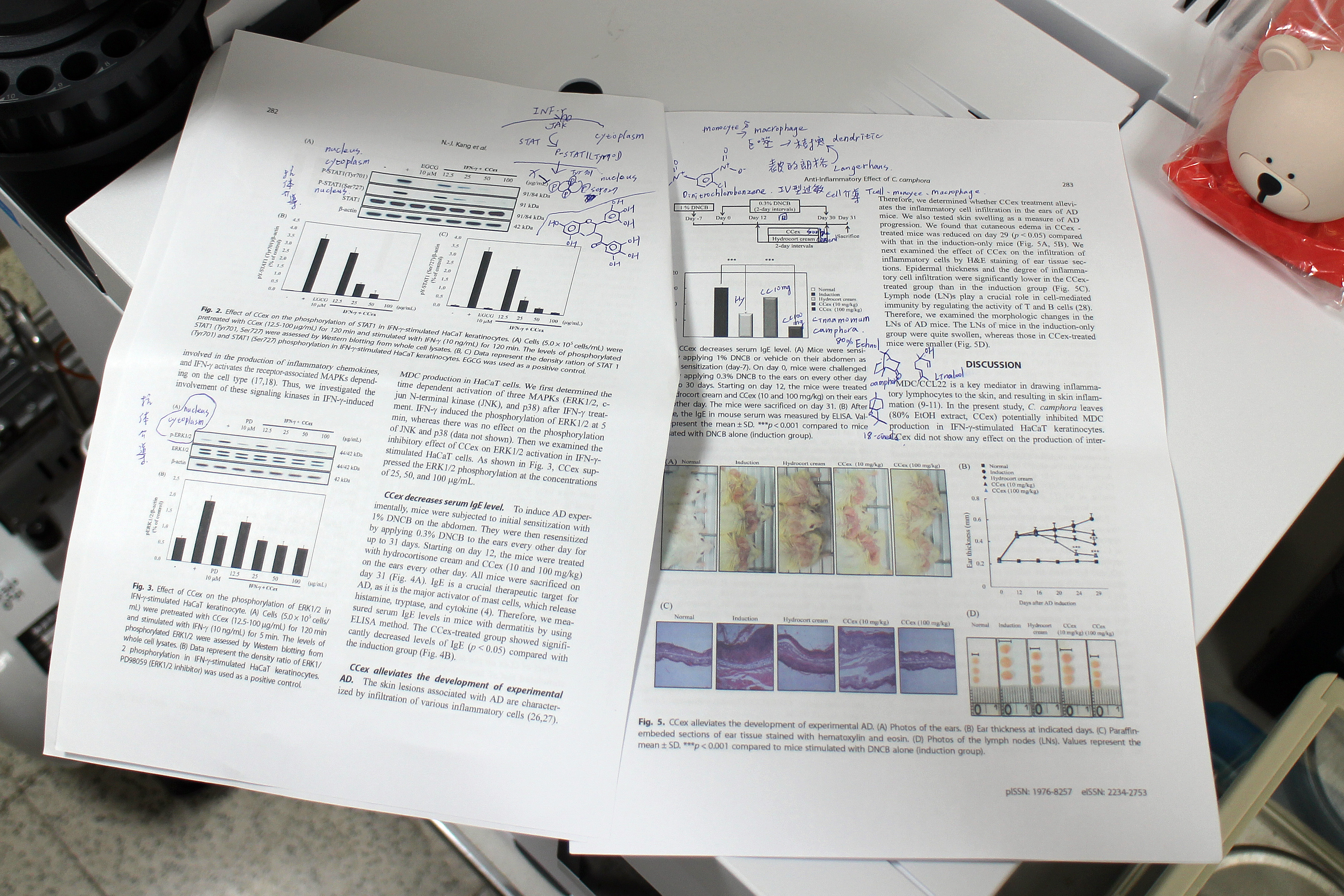 Cinnamomum camphora(CCa)乙醇萃取與兒茶素(EGCG) 可以降 MDC 以減少 IFN-γ 介導的巨噬細胞活化的發炎作用,也能降低角質形成細胞中的 pY-STAT1 (Tyr701+Ser727)、p-ERK 介導的致敏反應。